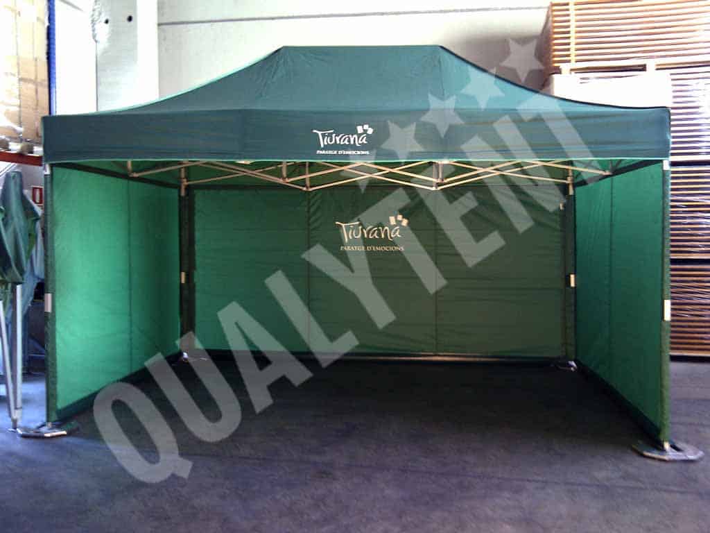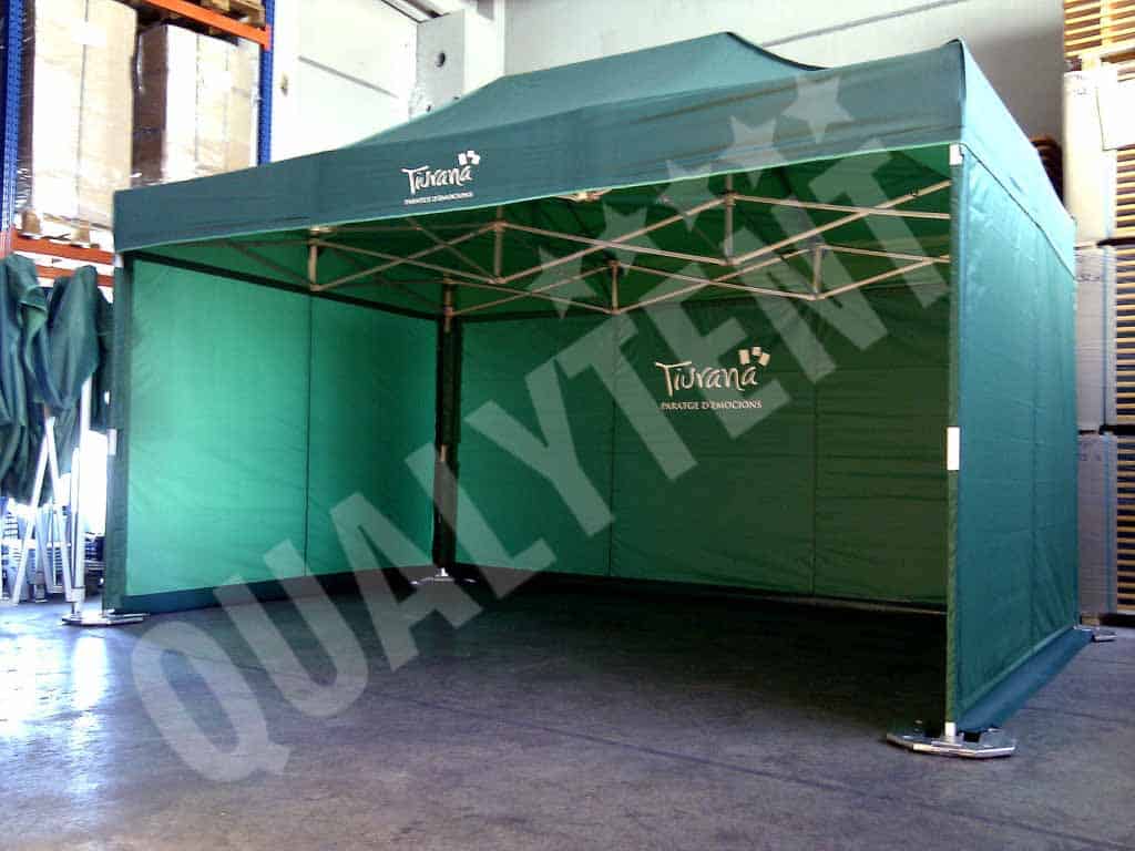 Esta é a tenda personalizada de 3×4.5m QT S-45 Premium que produzimos para o Município de Tiurana. Uma tenda dobrável de cor verde, tanto no teto como nas paredes e personalizada com os logos de Tiurana. E, tal como é habitual em todos os nossos modelos, com uma perfeita tensão das lonas (as paredes incorporam a nossa exclusiva barra de tensão) das nossas tendas extensíveis.
