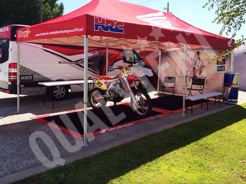 No entanto, também nos importamos com a imagem corporativa que apresentam, e por isso, realizámos uma cuidada personalização. Dois sistemas, quer seja com uma estampagem por calor ou digitalmente, como é o caso da tenda dobrável de 6x3m que entregámos ao piloto da Honda Hélder Rodrigues, e ao qual agradecemos a sua confiança nas nossas tendas dobráveis.