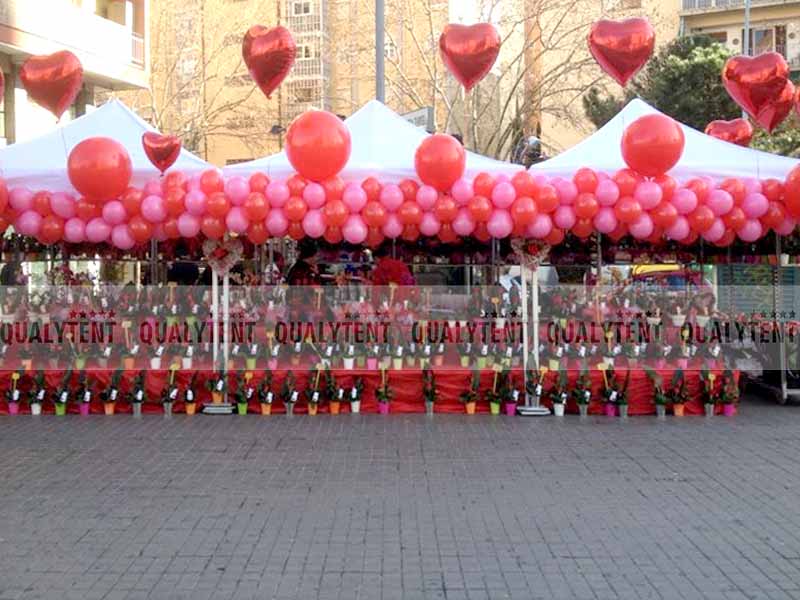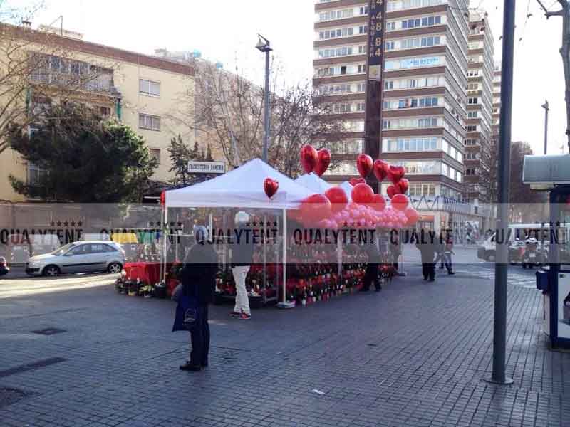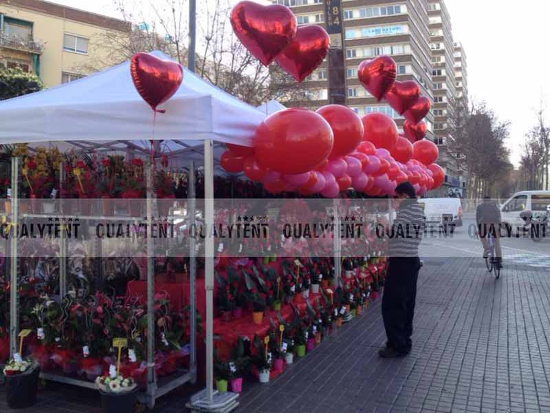 Montagem modular das nossas tendas dobráveis, para uma cadeia de floristas de Barcelona. O motivo? é o dia de S. Valentim. Com três das nossas tendas brancas 3x3m QT S-45 Premium, conseguimos um módulo amplo, com um espaço de 9x3m para a exposição de flores, assim como de outros artigos. A magnífica decoração, feita pelo cliente, foi perfeita para a ocasião. Claro está, foi um êxito de vendas.