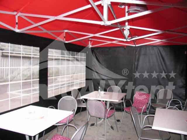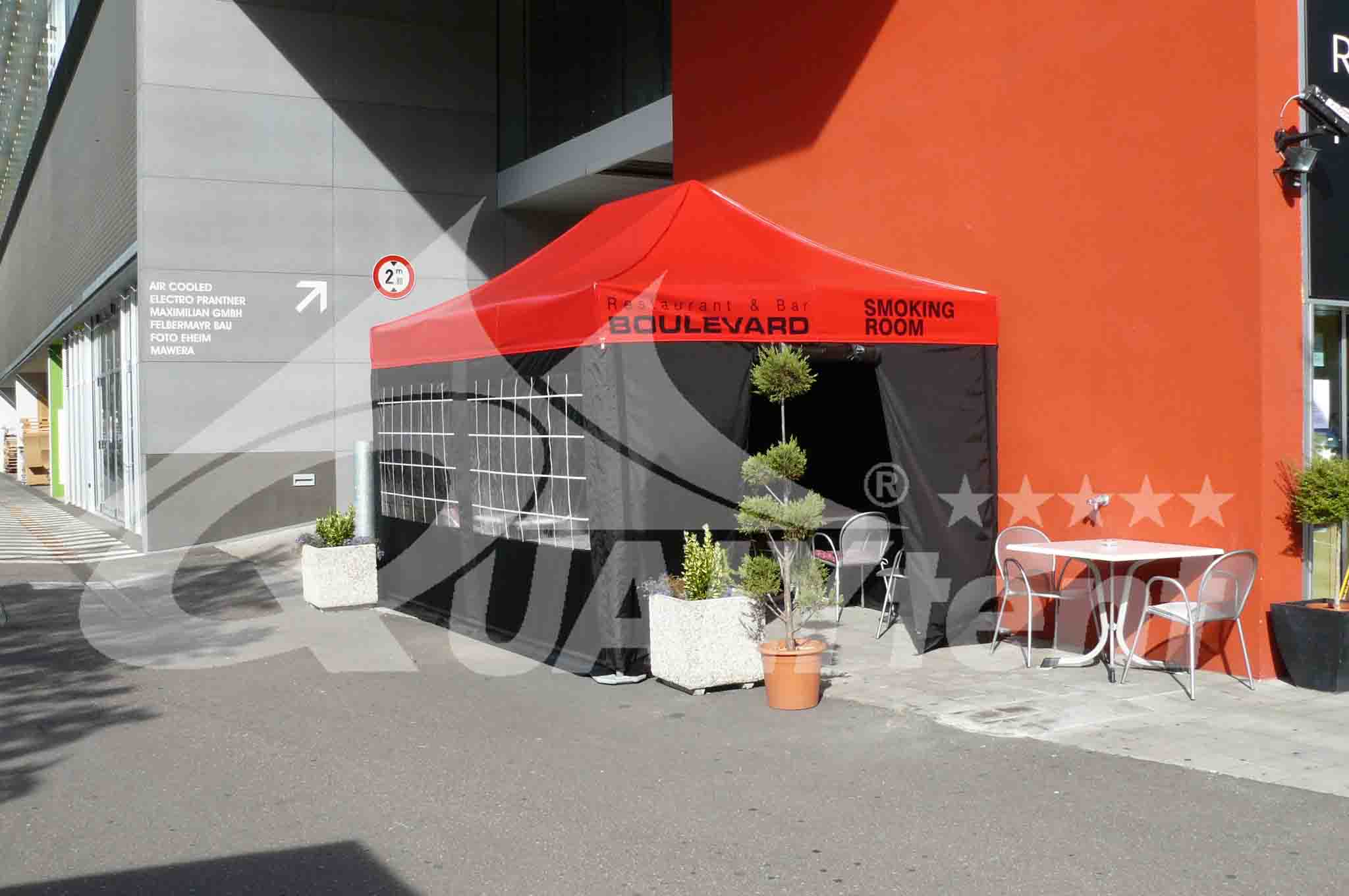 Tendas Smoking Room da Qualytent, elegantes e práticas. Esta tenda dobrável de 3×4.5m Premium, de cor preta e vermelha, foi personalizada para o restaurante Boulevard. Para assim possibilitar o abrigo aos seus clientes fumadores em dias frios, inclui iluminação interior.