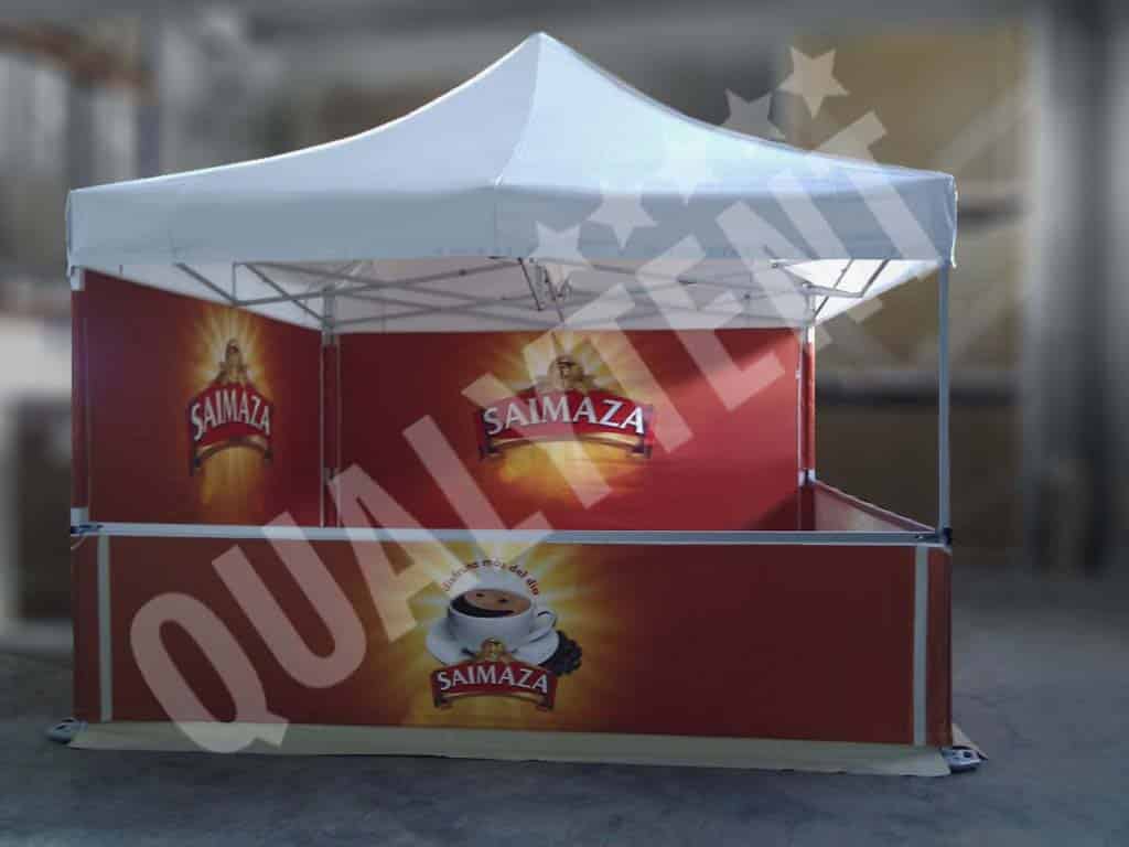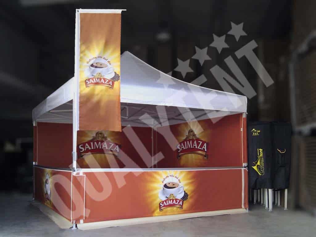 Esta é uma das tendas full print de 4x4m que produzimos com a personalização da empresa Saimaza. Umas tendas personalizadas, com teto de cor branca e rotuladas com o nosso sistema de impressão digital full print. Concretamente, nas paredes, pelos dois lados, com os logos da marca e também nas bandeiras.